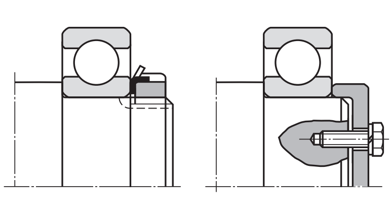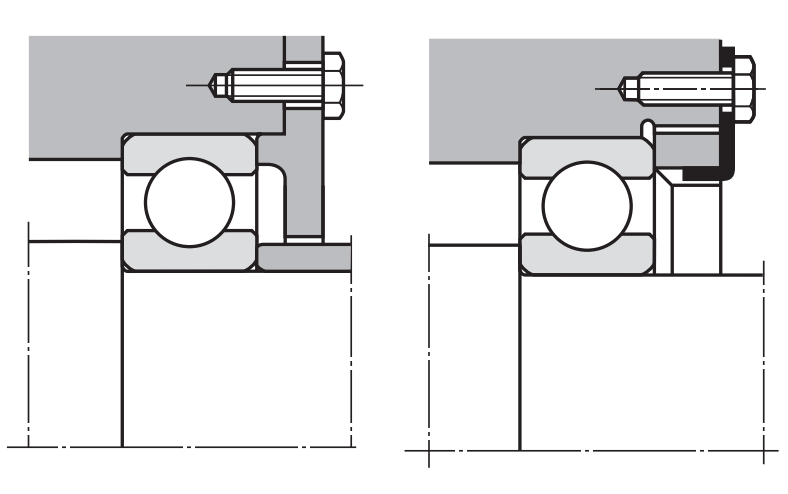 內外圈的固定,常見的辦法是通過緊定螺釘或螺栓,通過施加的力,使套圈端面產生輕微位移,緊貼在軸承上,如上圖所示,為內圈的固定,下圖所示,為外圈的固定。