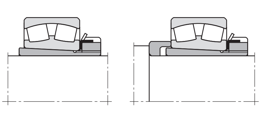 圓錐孔軸承安裝于圓柱軸時,一般會附帶緊定套或退卸套,方便軸承安裝與拆卸,緊定套和退卸套是通過壓力與靜摩擦系數生成摩擦力的原理設計的,可承受較大的單向軸向載荷,或一側有擋邊時,可承受較大的雙向軸向載荷,如下圖所示。