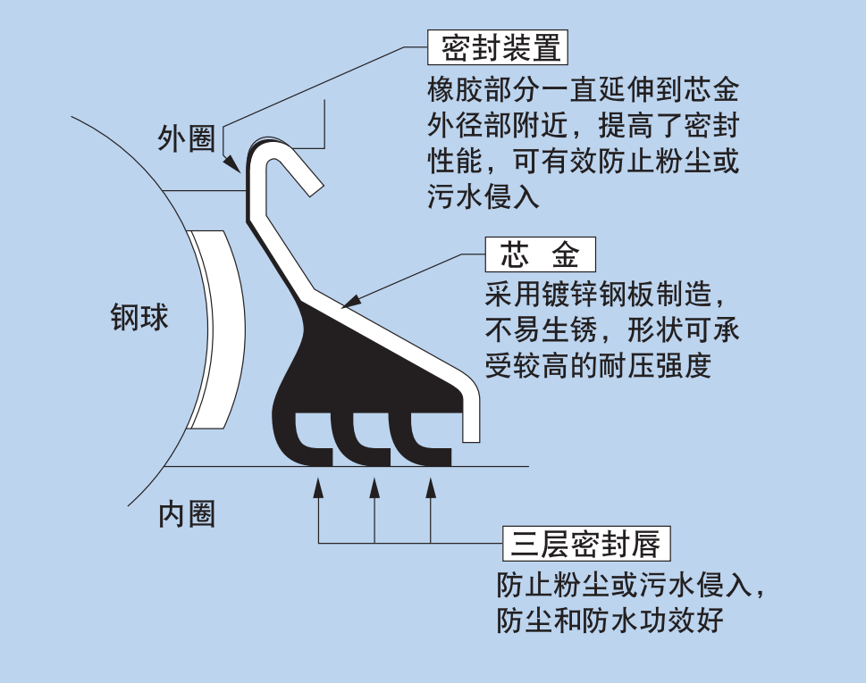 由于三重密封需要進行自我組配,且占用空間較大,因此在軸承座中,NTN使用三層密封方式,即一連三層相同的密封唇,通過其他不可思議、巧奪天工的設計,一樣也可以達到三重密封優異的防水防塵防污染性能,其組成如上圖所示。