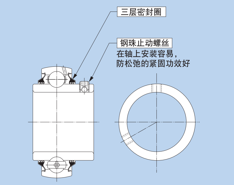 除了三層密封外,NTN使用鋼珠止動螺絲進行軸承固定,與帶螺紋的螺釘相比,鋼珠止動螺絲堅固效果更好,即便在受振動、沖動的場合下也能夠保持鎖緊,不易松弛。