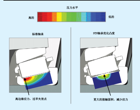 車橋OEM了解差速器側軸承的使用壽命很長。重載可導致差速器托架和軸承蓋總成偏轉,從而導致軸承滾道上的應力過大,從而降低軸承壽命。這就是為什么車橋OEM與NTN合作,設計這些帶有特殊滾柱和滾道頂部特征的側軸承,以延長軸承壽命。