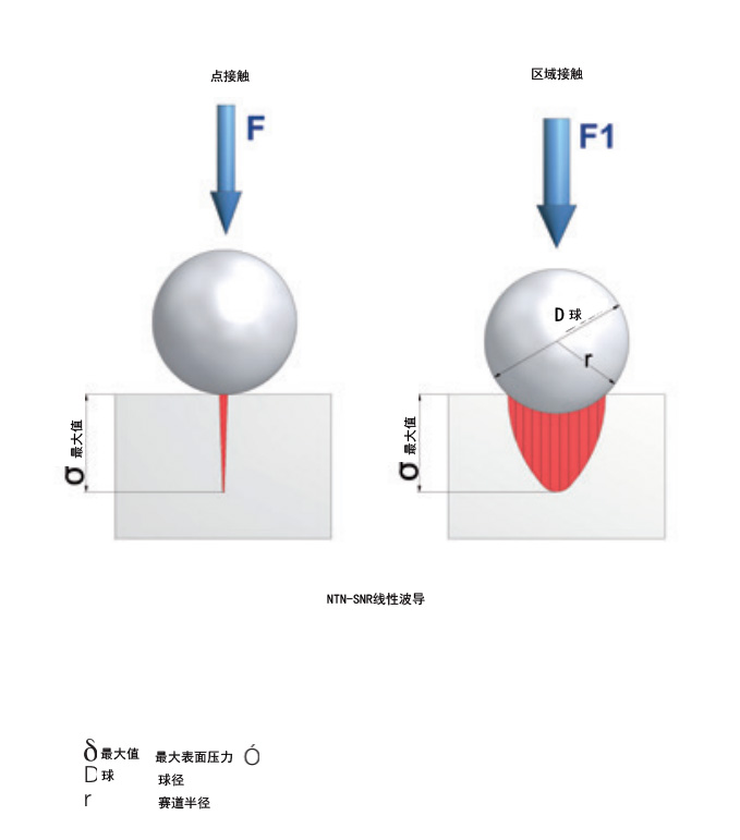 當球在某一點接觸平面時,會產生高表面壓力(如下圖)。現代線性導軌中的凹槽具有一定的半徑,以增加接觸面積。賽道半徑與球直徑之比(以百分比表示)稱為緊密度。這顯著提高了球的承載能力、使用壽命和剛性,以實現表面壓力相等。