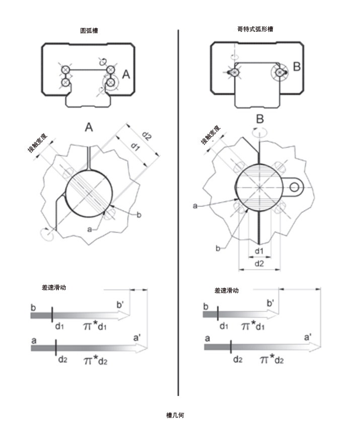 圓弧槽在型軌上有一個接觸面,在車架上有一個接觸面。這將創建兩點接觸。哥特式弧形槽的特殊形狀在型軌和車架上分別創建了兩個接觸面,從而與滾動元件實現了4點接觸。滾動元件的詳細視圖顯示,滑動差是由接觸直徑d1和d2之間的差異造成的。帶有哥特式圓弧槽的裝置的滑動差明顯大于圓弧槽的裝置。這將導致更高的摩擦系數、更高的驅動阻力、更高的磨損和更高的能耗。因此,NTN-SNR的標準線性導軌都有圓弧槽。哥特式弧形凹槽的幾何結構僅用于微型線性導軌,因為其設計緊湊。