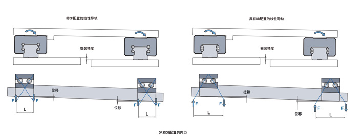 線性導向系統可能會受到安裝故障導致的扭矩應力的影響(如下圖)。當激活點之間的距離較小時,產生的內部載荷也較低。因此,NTN-SNR線性導軌是使用DF配置生產的。