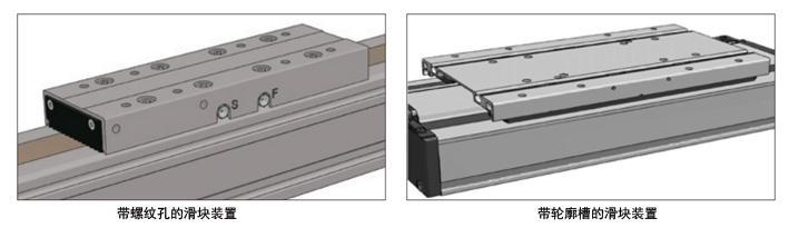 滑塊單元是一個復雜的組件組,通常由鋁型材或鋁組件組成。機架或履帶支重輪安裝在滑塊裝置上。滑塊單元還將驅動元件與直線軸的導向元件連接。滑塊裝置的頂部有螺紋孔或輪廓槽(如下圖),用于固定客戶的延伸部分。