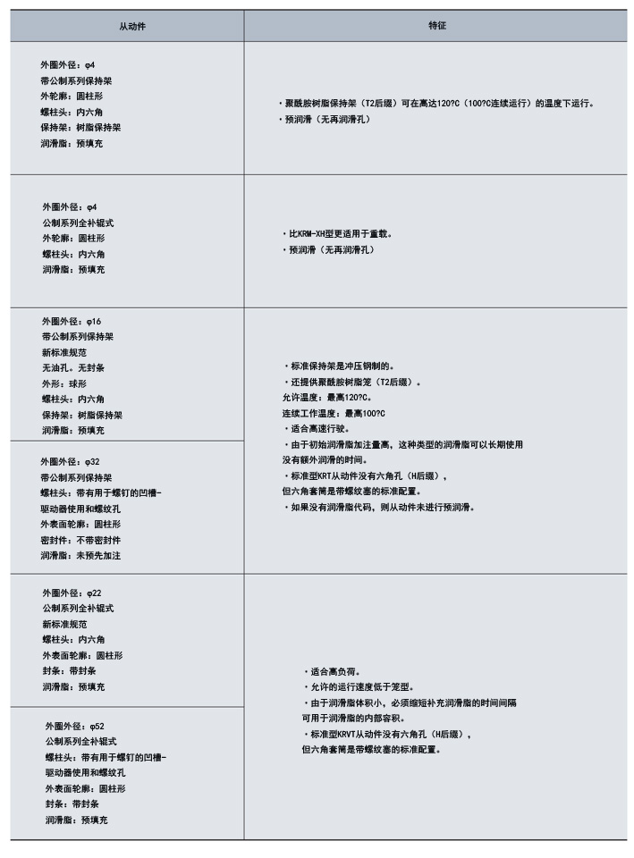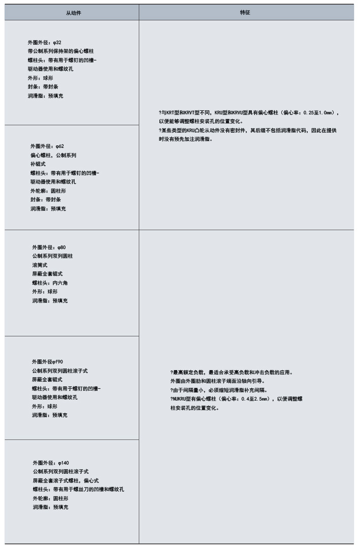 標有后綴(包括“F”)的凸輪從動件類型是符合新標準規范的產品。在裝配方法和潤滑方法方面,它們與傳統產品相同,但通過凸形滾柱和特殊熱處理改善了功能。請注意,后綴包括“F”但沒有油孔的凸輪從動件類型預先填充了尿素基高功能性潤滑脂,并用后綴包括“DO”標識。