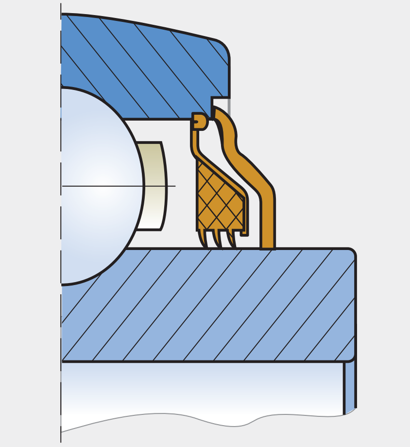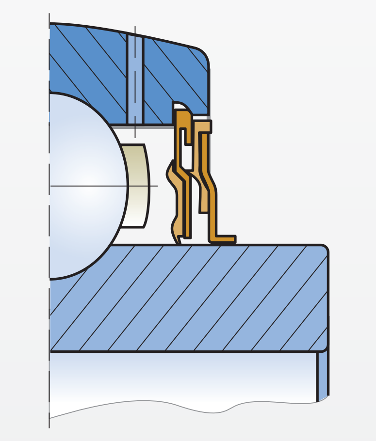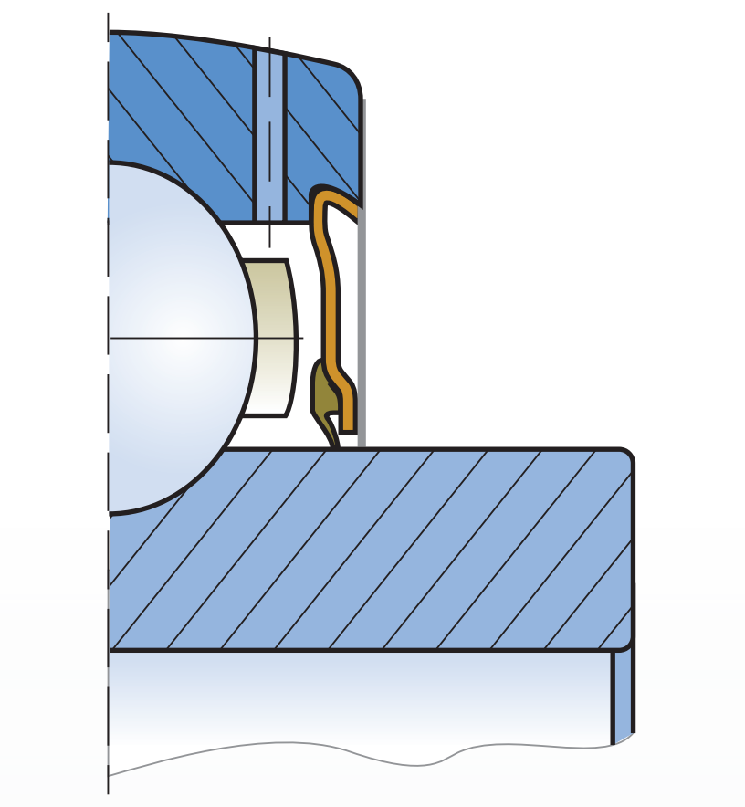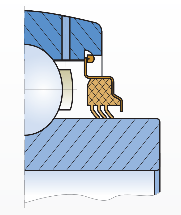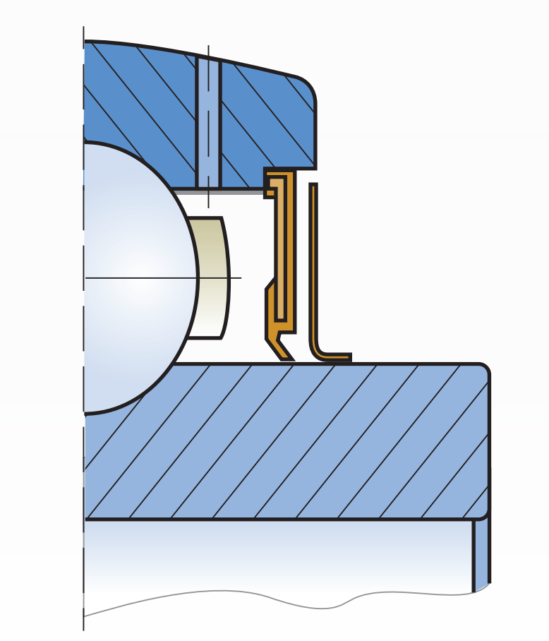 三層丁腈橡膠唇形密封,由耐腐蝕金屬板提供額外保護,適用于UC…L3和EX…L3系列,該類密封的外球面軸承適用于重污染的應用,但極限轉速較低,約為同尺寸單唇形密封的30%。