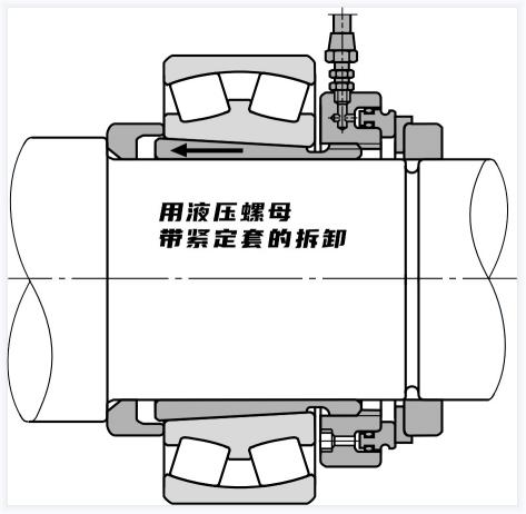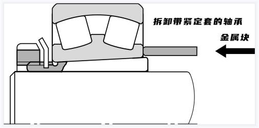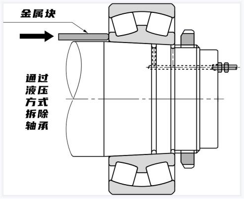 錐形孔軸承的拆卸如下圖所示,通過擰松緊固螺母,在內(nèi)圈上放置一個(gè)金屬塊,并用錘子敲擊,拆下使用適配器套筒安裝的小軸承,通過使用液壓拆卸方式,可以方便地使用適配器套筒或拆卸套筒拆卸安裝在錐形軸上的大型軸承。