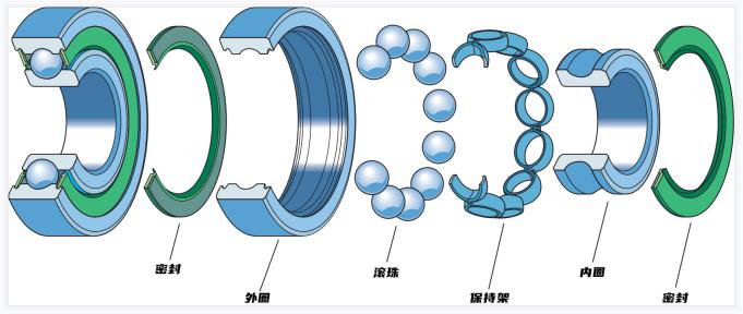 滾動元件(滾珠或滾子)在內圈和外圈之間傳遞載荷,通常,滾動元件使用與軸承套圈材質相同的鋼,若有需要,也可以使用陶瓷材質,陶瓷滾動元件的軸承又被稱為混合陶瓷軸承,而且使用的越來越普遍。