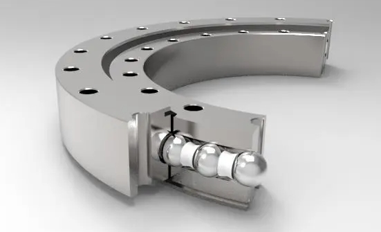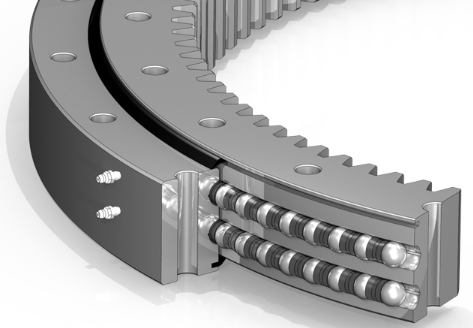 八、單列四點接觸球回轉支承(Q系列)軸承。單列四點接觸球回轉支承軸承由兩個座圈組成,結構緊湊,重量輕,鋼球和圓形滾道有四個角,可以同時承受軸向力、傾覆力矩和大軸向力,廣泛應用于旋轉輸送機、焊接操作機、中小型超重機器和挖掘機中。