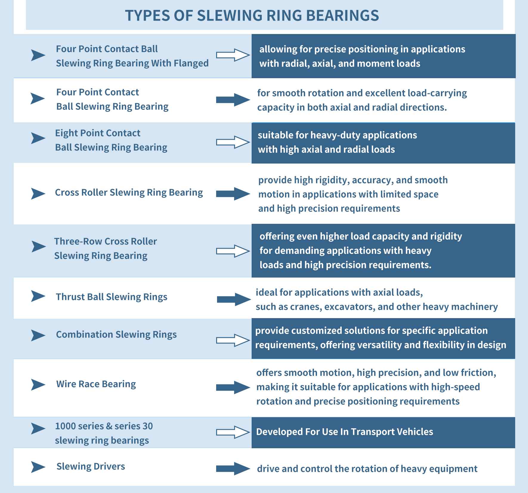 回轉支承的類型包括滾珠回轉支承、滾子回轉支承、組合回轉支承、推力滾珠回轉支承和鋼絲圈軸承等,有些是標準化的,有些帶法蘭,回轉軸承的齒輪包括外齒輪和內齒輪,有些沒有任何齒輪,有關這些類型軸承及其特性的更多詳細信息,請參閱上圖。