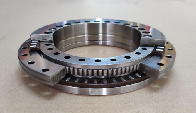 七、轉盤軸承(精密軸承組合)。轉盤軸承用于需要高剛性和高精度的旋轉運動工作臺,轉盤軸承通常結合了角接觸軸承和圓柱滾子軸承的性能,在提供高精度旋轉的同時可以承受高載荷。