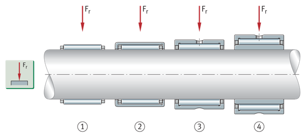 用于靜態和動態錯位補償的軸承 ①滾子軸承(非定位軸承) ②調心滾子軸承(定位軸承) ③調心球軸承(定位軸承) ④環形滾子軸承(非定位軸承) | ![]() |