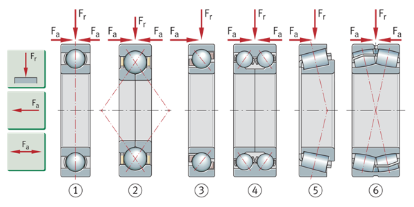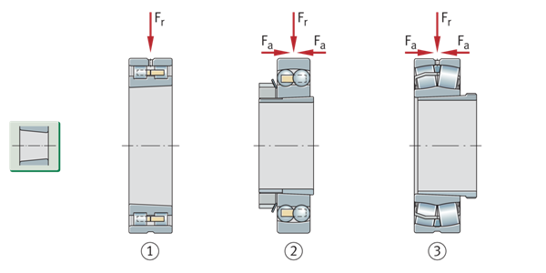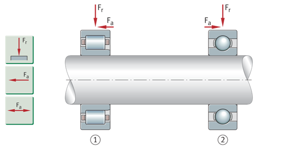 一個方向上存在的軸向載荷只能由單列角接觸球軸承和圓錐滾子軸承、圓柱滾子軸承NJ以及NU+HJ和軸向調心滾子軸承支撐。對于交替的負載方向,這些軸承必須始終與第二個軸承一起安裝(第二個軸承必須在相反的方向上提供支撐)。對于成組安裝,可使用配對的單列角接觸球軸承或由兩個單個軸承組成的匹配圓錐滾子軸承組。