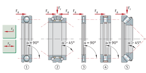 如果存在低到中等的純軸向載荷,合適的軸承是軸向深溝球軸承和四點接觸軸承,如果存在一個方向的軸向載荷,則可以使用單向軸向深溝球軸承。