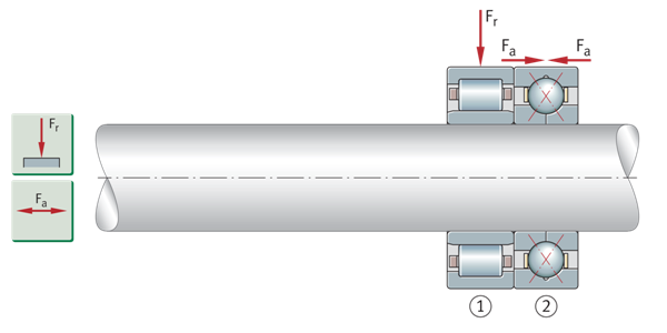 用于支撐組合載荷的圓柱滾子軸承和四點接觸球軸承 ①圓柱滾子軸承NU,徑向軸承 ②四點接觸球軸承,軸向軸承(如果軸承承受純軸向載荷,則徑向不得保留外圈) | ![]() |