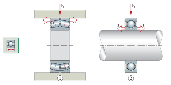 通過滑動座進行長度補償 s=軸向位移距離(軸承套圈松配合) ①調心滾子軸承,內圈可移動(松配合) ②深溝球軸承,外圈可移動(松配合) | ![]() |