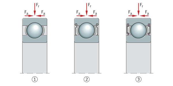 單列深溝球軸承,開式或密封 Fr=徑向載荷 Fa=軸向載荷 ①開式 ②兩側密封(非接觸式) ③兩側接觸式密封 | ![]() |
