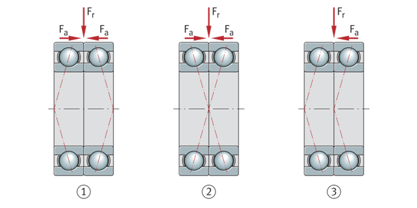 配對軸承組 Fr=徑向載荷 Fa=軸向載荷 ①背對背配對 ②面對面配對 ③串聯配對 | ![]() |