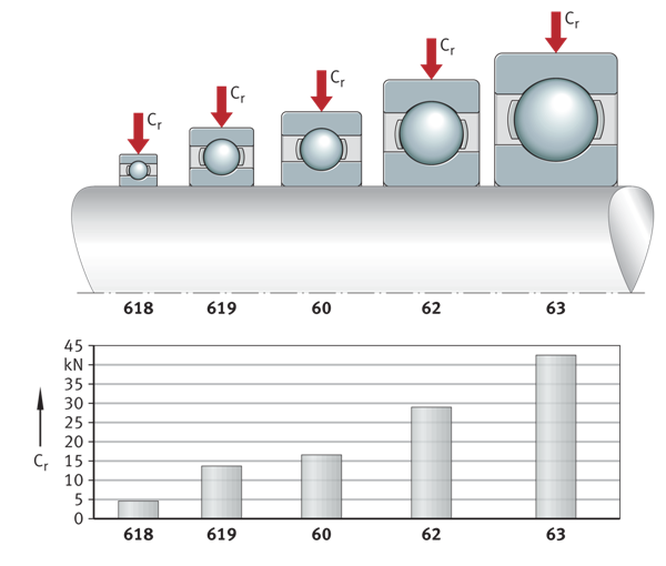 單列深溝球軸承 d=40mm軸承的橫截面和承載能力(徑向承載能力Cr)的比較 Cr=基本動態額定載荷 | ![]() |