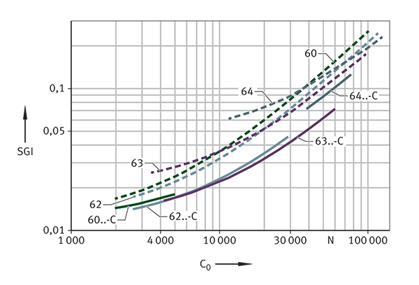 SGI值基于內部標準中軸承的最大允許噪聲水平,該標準是根據ISO 15242計算得出的。為了能夠比較不同的軸承類型和系列,將SGI值與基本額定靜載荷C0進行對比。