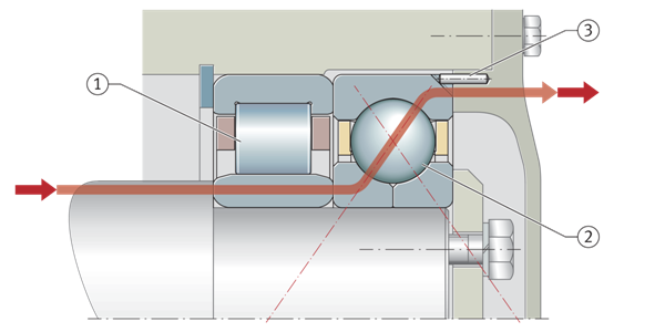 用作軸向軸承的四點(diǎn)接觸球軸承 ①圓柱滾子軸承(徑向軸承) ②外圈帶固定槽的四點(diǎn)接觸軸承(軸向軸承,外圈未徑向固定) ③外圈鎖銷 | ![]() |