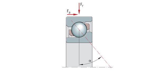 接觸角α是接觸線和徑向平面所包含的角度,在該角度下,載荷從一個滾道傳遞到另一個。軸承的軸向承載能力隨著α的值而增加,即角度越大,軸承所承受的軸向載荷就越高。因此,角接觸球軸承比深溝球軸承更適合支撐更高的軸向力。由于標(biāo)稱接觸角α=40°,單列角接觸球軸承可以在一側(cè)承受高軸向載荷。