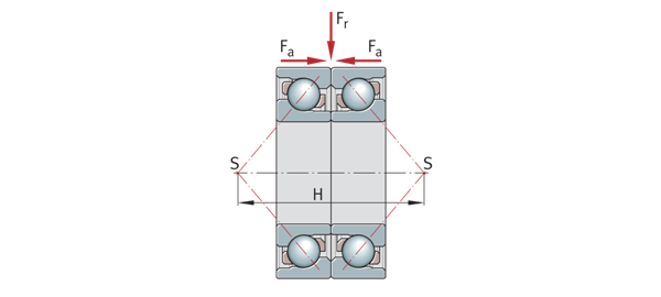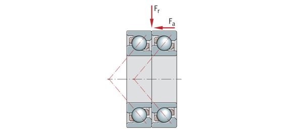 在串聯(lián)布置中,接觸線彼此平行地延伸。軸向力均勻分布在兩個軸承上,但只能由軸承組從一個方向支撐。為了支撐來自相反方向的軸向力以及組合載荷,軸承組總是針對另一個軸承進(jìn)行調(diào)整。