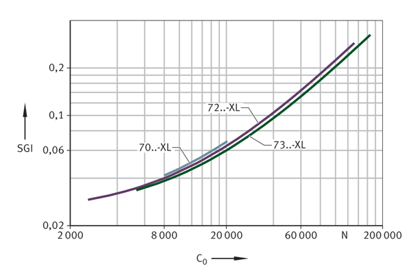 SGI值基于內(nèi)部標(biāo)準(zhǔn)中軸承的最大允許噪聲水平,該標(biāo)準(zhǔn)是根據(jù)ISO 15242計算得出的。為了能夠比較不同的軸承類型和系列,將SGI值與基本額定靜載荷C0進(jìn)行對比。