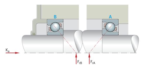 調(diào)整后的軸承布置 具有兩個O形排列的單列角接觸球軸承,外力 Ka=作用在軸承上的外部軸向力 FrA=徑向載荷,軸承A FrB=徑向載荷,軸承B | ![]() |