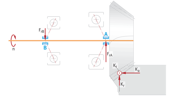 軸承A支持外部軸向力Ka。由于這是具有兩個單列軸承的調(diào)整軸承布置,因此在進(jìn)行軸承計算時,必須考慮軸承系統(tǒng)中產(chǎn)生的內(nèi)部軸向力Fa。