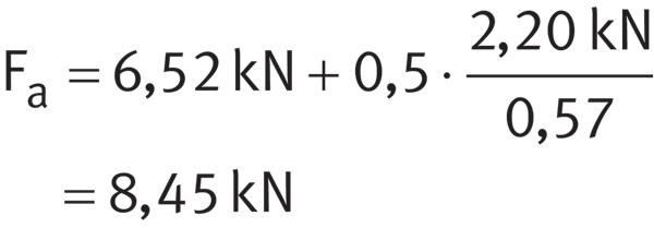 為了計算等效動態(tài)軸承載荷P,然后將Fa的計算值用于軸承A,因為Fa/FrA>1,14(8,45 kN/7,30 kN>1,14)。