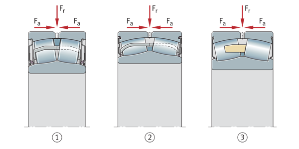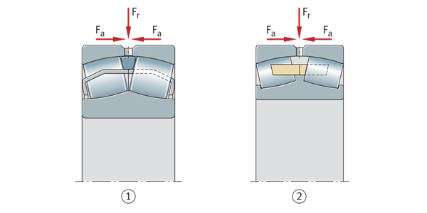 調心滾子軸承支持來自兩個方向的高軸向力。然而,如果非常高的軸向載荷與非常高的速度相結合,則必須考慮軸承中溫度和摩擦的增加。