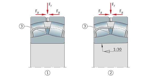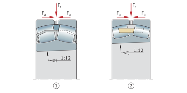 圓錐孔基本設計調心滾子軸承 Fr=徑向載荷 Fa=軸向載荷 ①內圈無中心肋調心滾子軸承 ②內圈帶剛性中心肋的調心滾子軸承 | ![]() |
