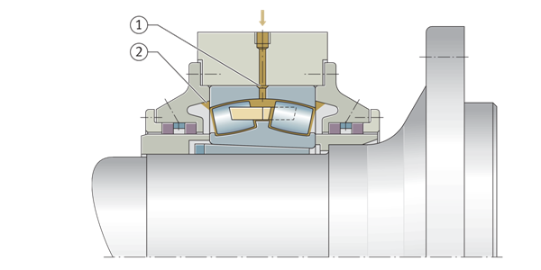 用液壓螺母安裝大型軸承 ①帶錐形孔的調心滾子軸承直接安裝在錐形軸頸上 ②液壓螺母 | ![]() |