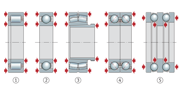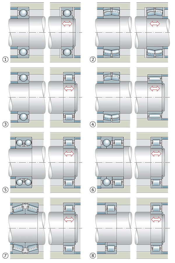 圖中顯示了可用作定位軸承并可支撐兩個方向上的軸向力的軸承類型。箭頭顯示了軸向定位方法在各種類型的安裝和軸承類型中執行的任務,例如深溝球軸承外圈和內圈兩側的軸向定位。