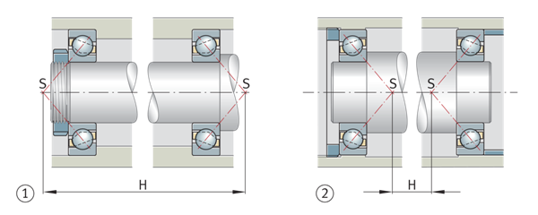 帶角接觸球軸承的調整軸承布置 S=接觸錐頂點 H=支架間距 ①O排列 ②X排列 | ![]() |