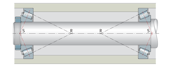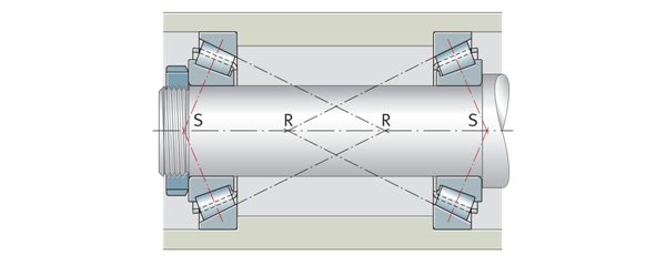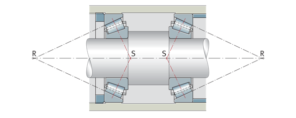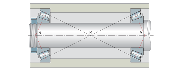 使用圓錐滾子軸承調整軸承布置 X排列 R=圓錐滾子頂點 S=接觸錐頂點 | ![]() |