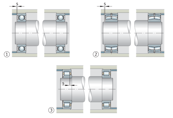 浮動軸承布置 s=軸向位移距離(軸向間隙) ①深溝球軸承 ②調心滾子軸承 ③圓柱滾子軸承NJ | ![]() |
