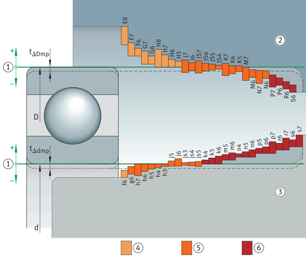 滾動軸承的軸和殼體配合 D=標稱軸承外徑 d=標稱軸承孔徑 tΔDmp=平均軸承外徑的偏差(根據ISO 492) tΔdmp=平均軸承孔徑的偏差(根據ISO 492) ①零線 ②外殼 ③軸 ④間隙配合 ⑤過渡配合 ⑥過盈配合 | ![]() |