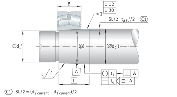 錐形軸承座的幾何公差和位置公差的指導值 B=軸承寬度 SL=L·錐度比(1:12,1:30) tΔSL′=錐角公差 t1=圓度公差 t6=垂直度公差=2/3·t2 z=推薦平均粗糙度 | ![]() |