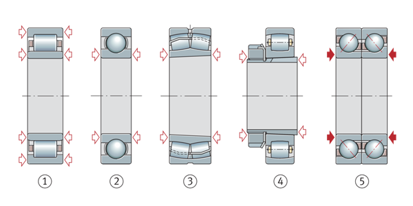 定位軸承中軸承套圈的軸向位置 ①圓柱滾子軸承NUP ②深溝球軸承 ③調心滾子軸承 ④角接觸球軸承對 ⑤雙向軸向深溝球軸承 | ![]() |
