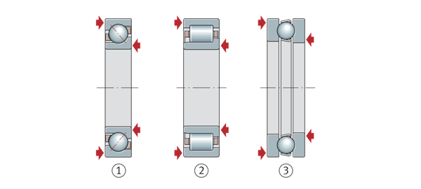 角接觸球軸承僅支持一個方向的軸向力。因此,軸承套圈只需要根據力的模式在每一側上鄰接。軸向分力由對稱布置中的附加軸承支撐。在圓柱滾子軸承NJ中也存在類似的情況。