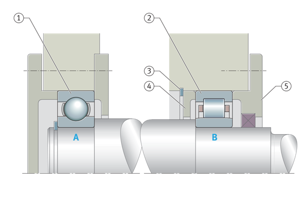 深溝球軸承和圓柱滾子軸承的軸向位置 A=定位軸承 B=非定位軸承 ①深溝球軸承 ②圓柱滾子軸承NU ③卡環 ④墊圈 ⑤端蓋 | ![]() |