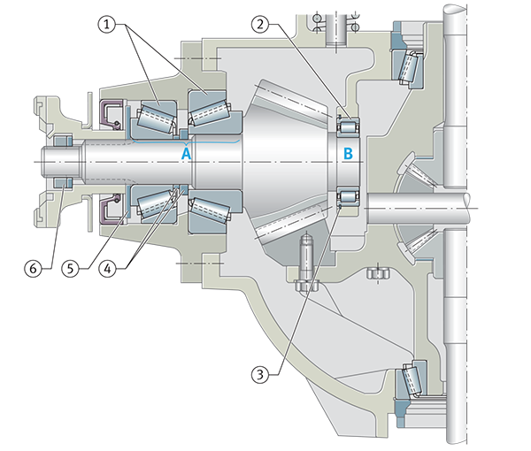 圓錐滾子軸承對和圓柱滾子軸承的軸向位置 A=定位軸承 B=非定位軸承 ①一對圓錐滾子軸承 ②圓柱滾子軸承 ③卡環 ④墊圈 ⑤墊片 ⑥軸螺母 | ![]() |