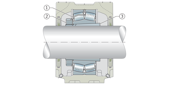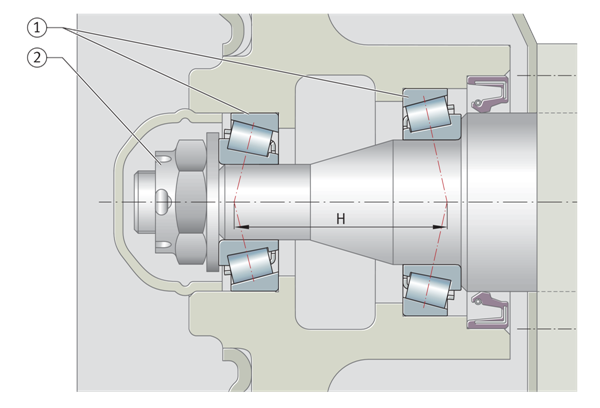 圓錐滾子軸承對的軸向位置 ①圓錐滾子軸承對,O型布置 ②固定螺母 | ![]() |