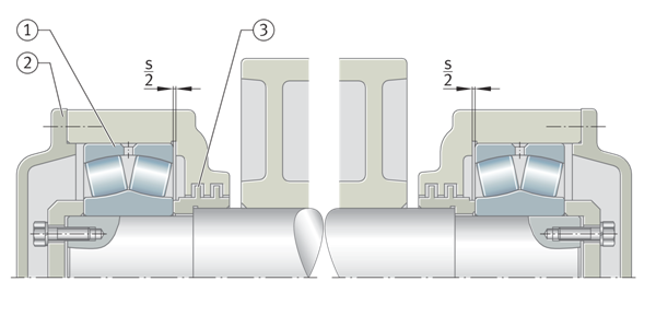 兩個調心滾子軸承的軸向位置 s=軸向位移距離 ①調心滾子軸承 ②密封蓋 ③帶迷宮式通道的隔套 | ![]() |