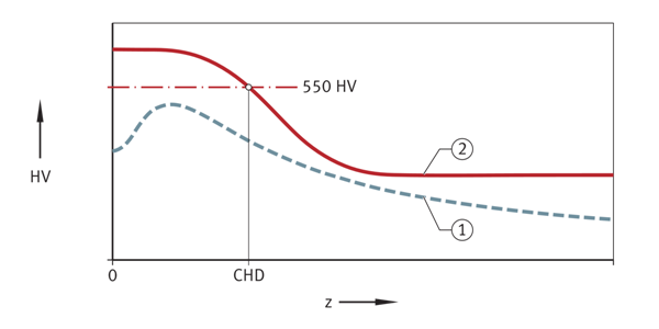 表面硬化深度和硬度分布 HV=維氏硬度 z=接觸面下的深度 ①必要硬度(等效應力剖面) ②實際硬度剖面 | ![]() |