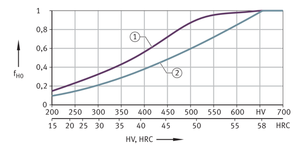 滾道硬度降低時的動態硬度系數 fH=動態硬度系數 HV,HRC=表面硬度 | ![]() |