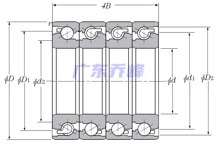 滾珠絲杠用四列角接觸推力球軸承 - DBTT配對,開式,三排承受軸向載荷 - 尺寸